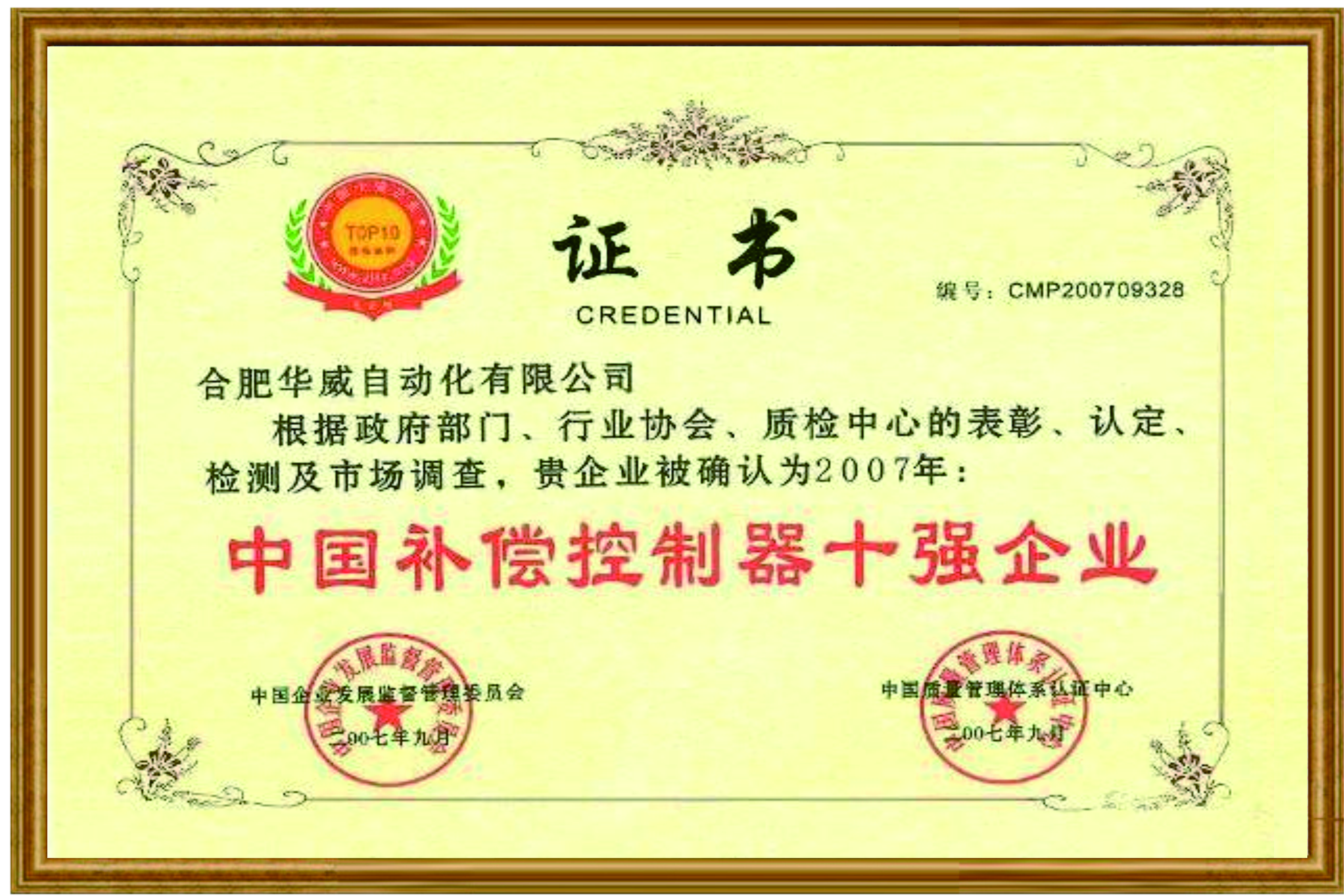 中國補(bǔ)償控制器十強(qiáng)企業(yè)證書